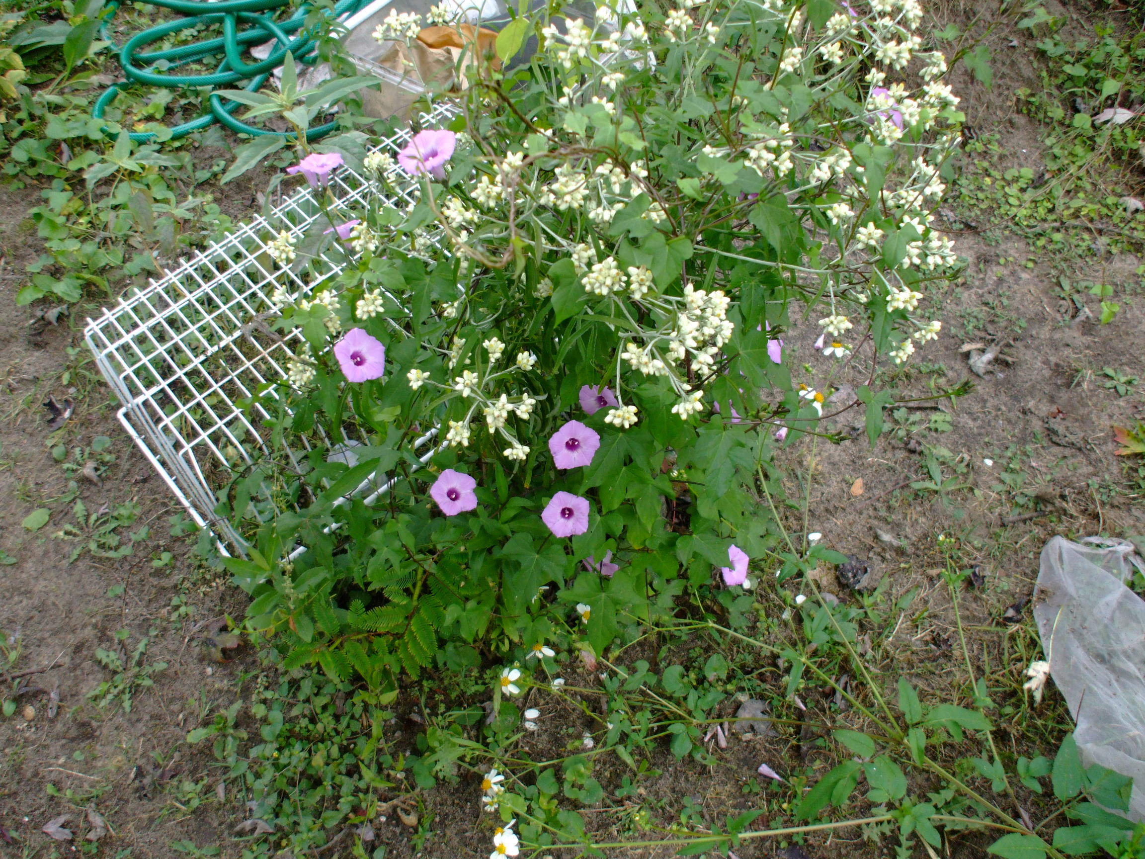 Ipomoea cordatotriloba, or Tievine, is native to the much of the southeastern US. It is a tender perennial that is grown as an annual in some places with cold winters; it grows in a variety of places, including woods and along woodland edges, ravines, riverbanks, as well as along roadsides and waste areas. It blooms year round where warm enough, and in late summer into fall in colder areas, with ypink to light purple flowers.