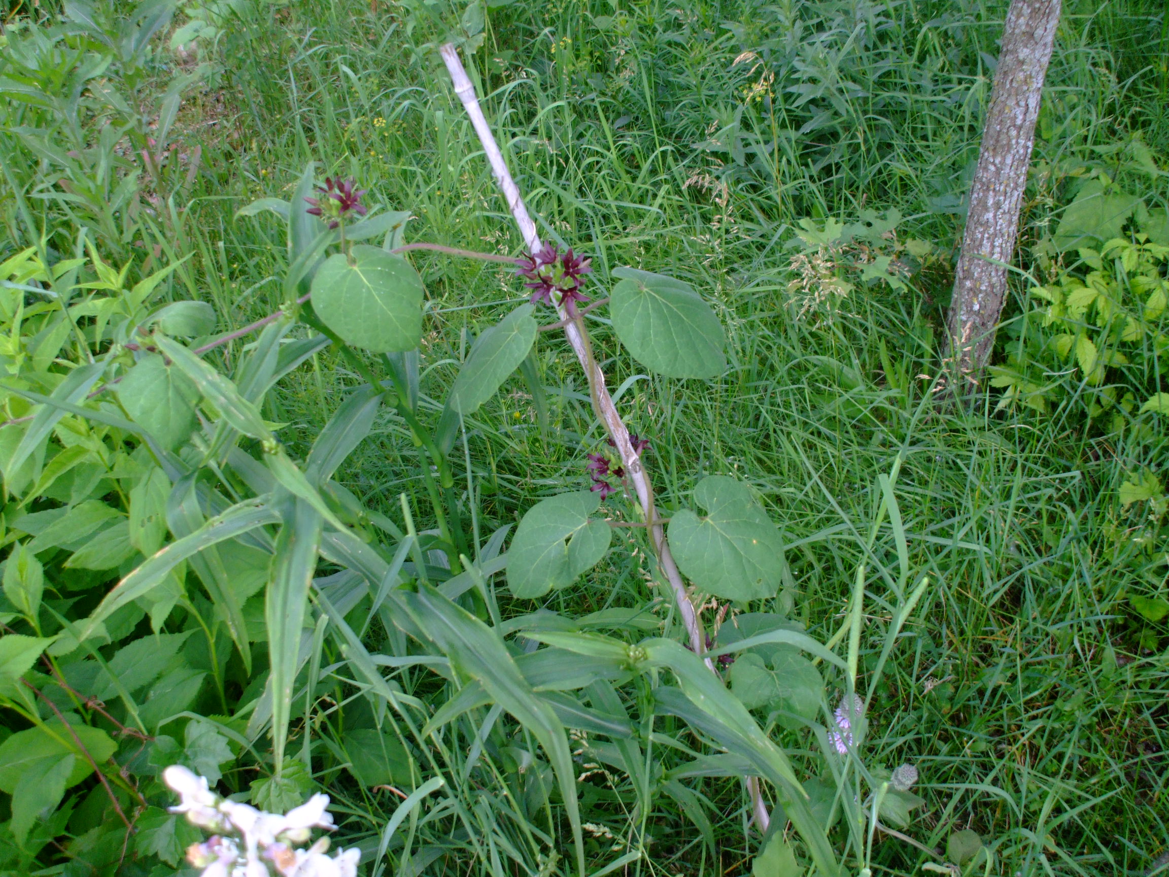 Matelea decipiens, or Climbing Milkweed, is native to the Central and Southeastern US, though rare in the Southeast. It is a perennial vine that grows in open woods, glades, thickets and along woodland edges and streambanks. It blooms in late spring into early summer with dark maroon flowers.