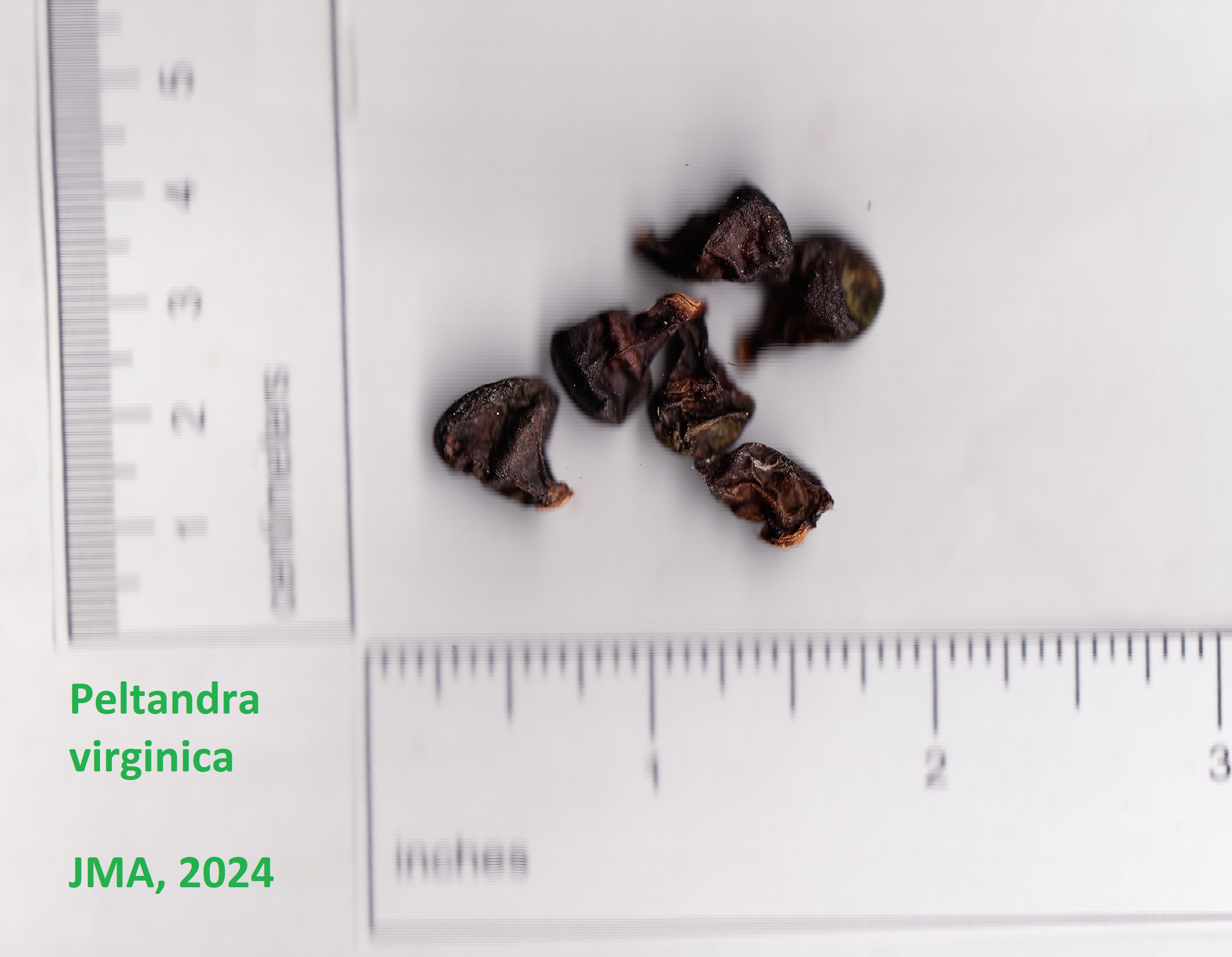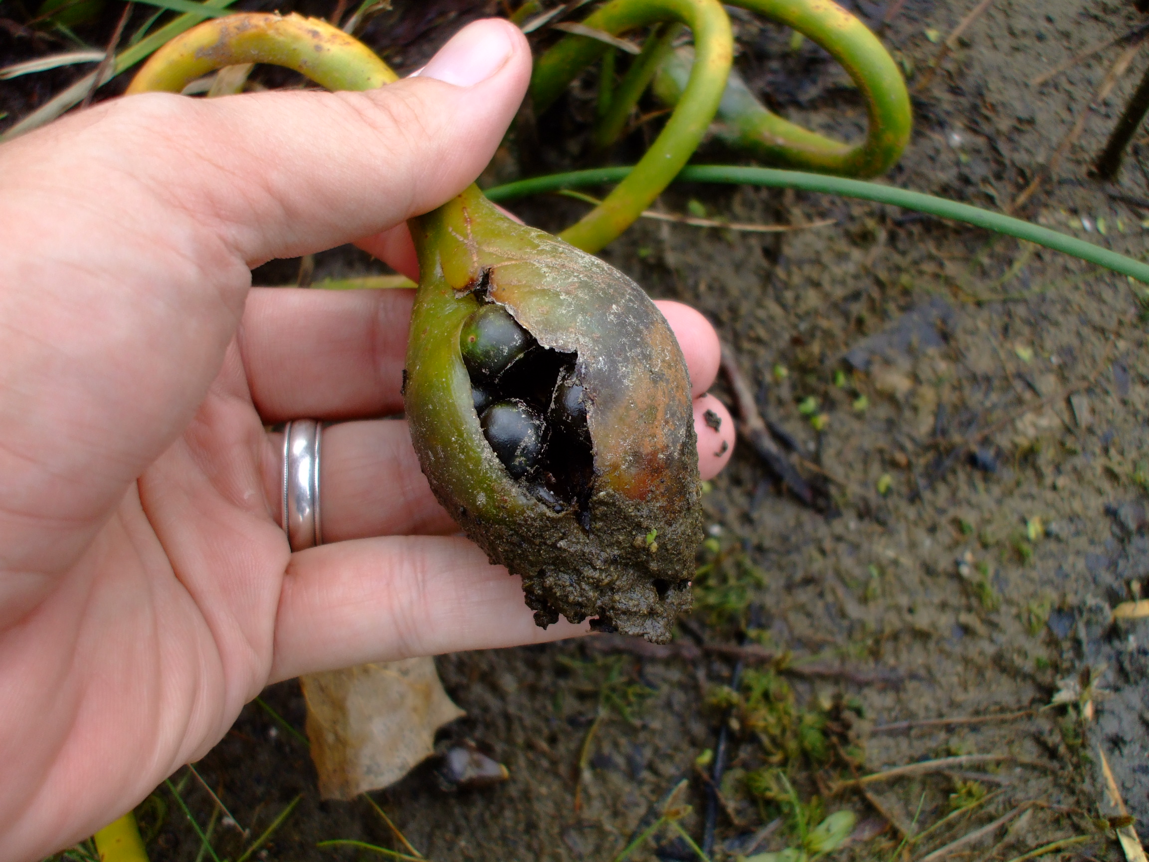 Peltandra virginica, or Arrow Arum, is native to the much of the eastern half US,and is also found in Oregon and California. It is an aquatic perennial that grows on pond margins, ditches, swamps, bogs, marshes and other wet areas. It blooms in early to mid spring with green-white flowers.