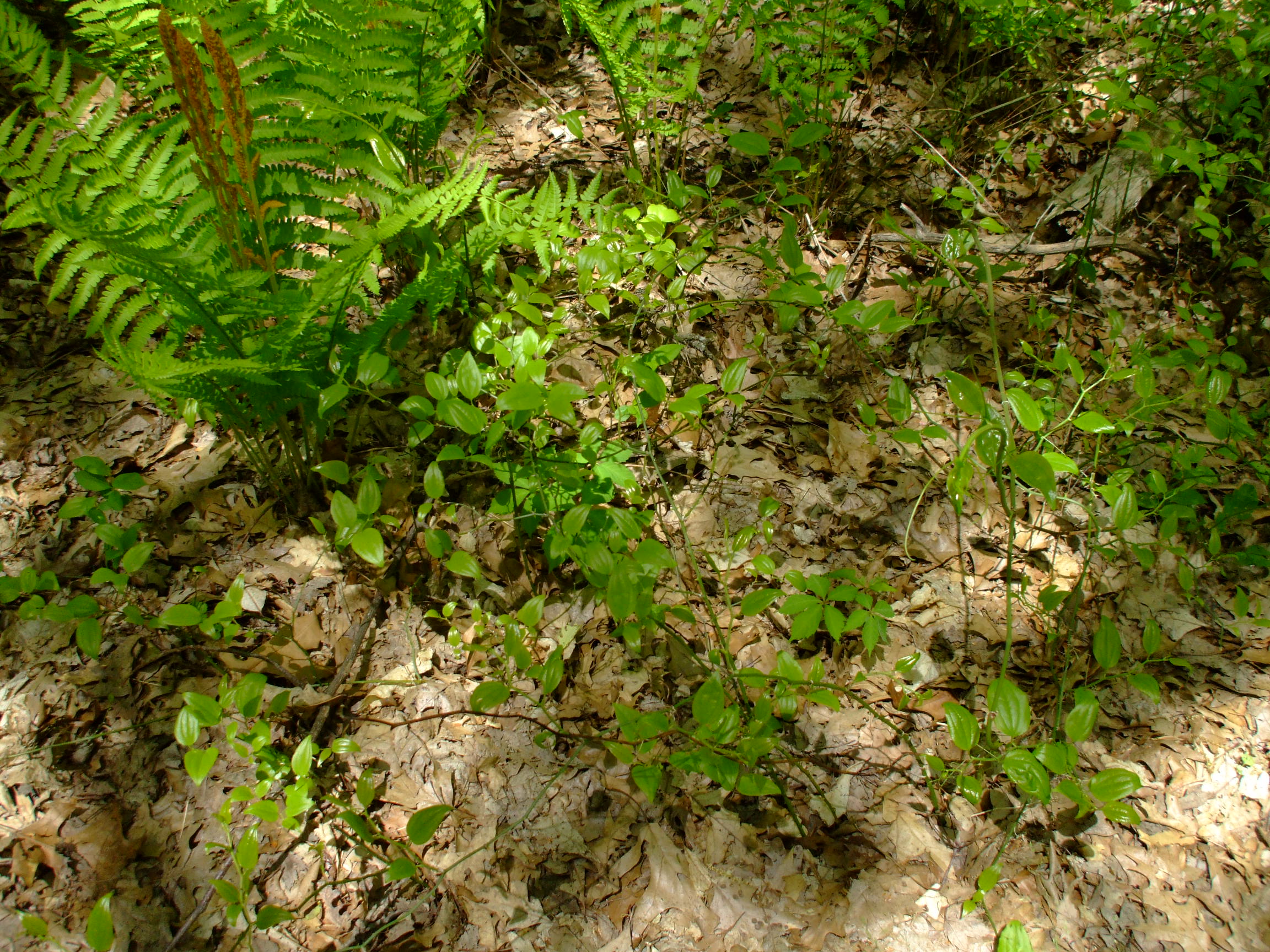 Smilax rotundifolia, or Roundleaf Greenbrier, is native to almost the entire eastern US. It is a perennial that grows in partially shaded woods and along woodland edges, and in thickets, open meadows and along streambanks. It blooms in early to mid spring into early summer with green-yellow flowers. Plants are either male or female, with slightly different flowers on each.